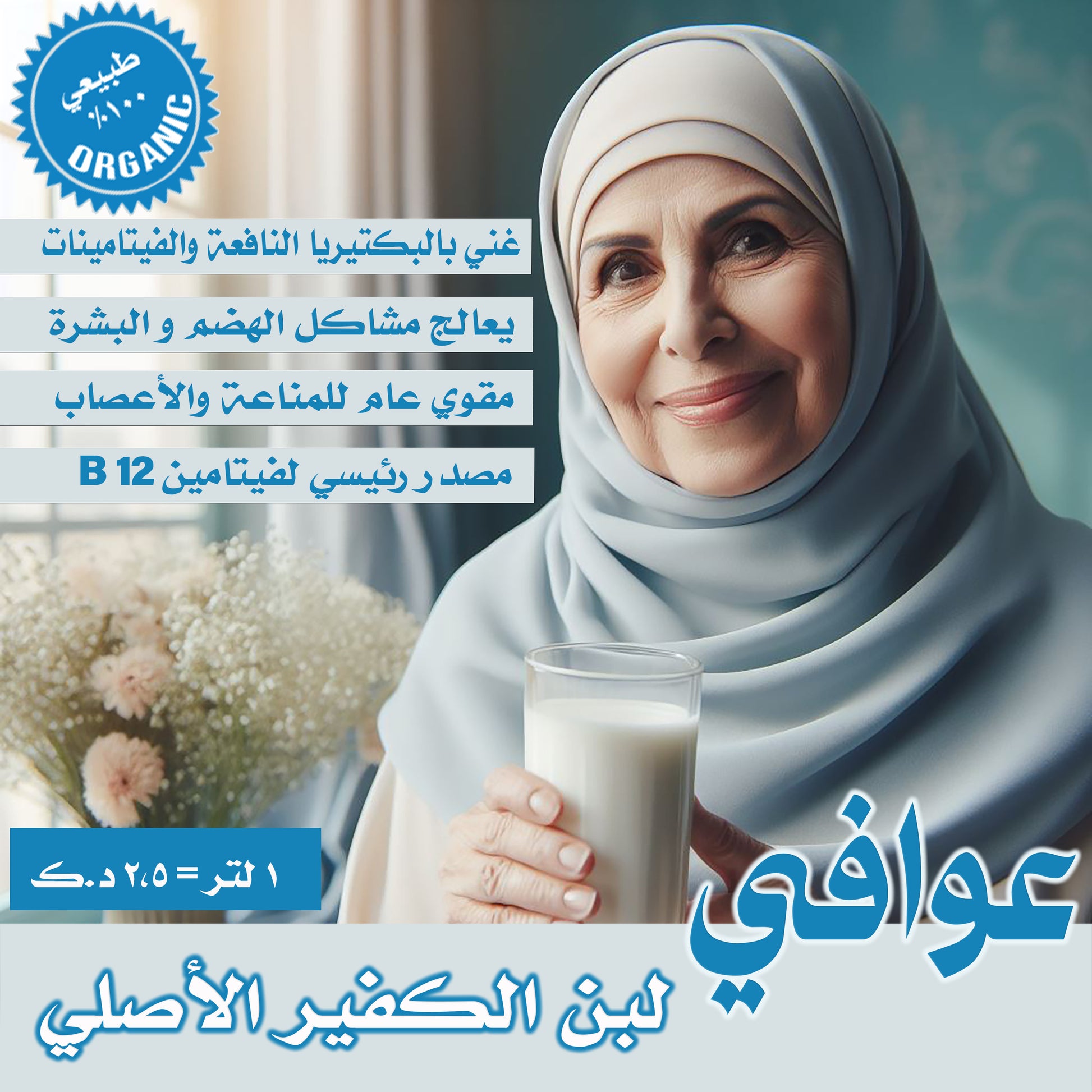 • كفير عوافي هو لبن الكفير المخمر تخميراً مضاعفاً بفوائد مضاعفة أيضاً .